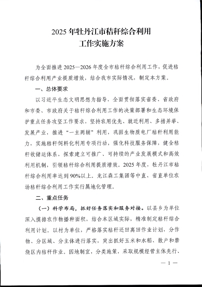关于印发《2025年牡丹江市秸秆综合利用工作实施方案》的通知